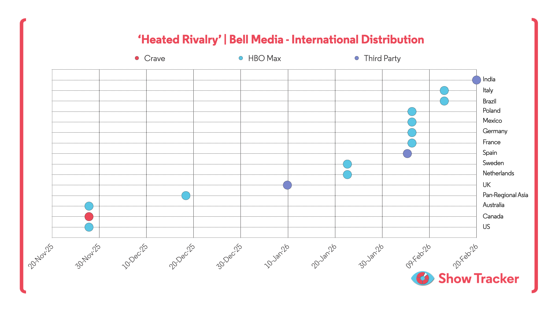 ‘Heated Rivalry’ has yet to premiere in several major territories, including China, Japan, South Korea and South Africa, with further deals expected. We will continue to track additional sales and premiere activity as they are announced.