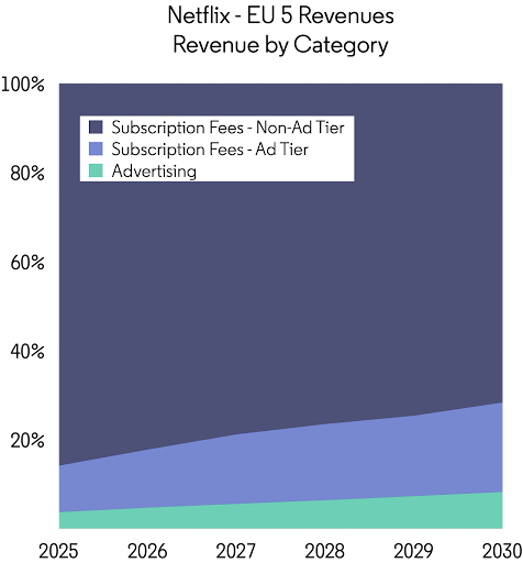 Netflix’s position as Europe’s leading streaming platform is shifting from a story of scale to one of revenue diversification. Amassing 73 million subscribers by 2030, Netflix’s top 5 European markets are undergoing a huge shift in the balance between subscription and advertising income.