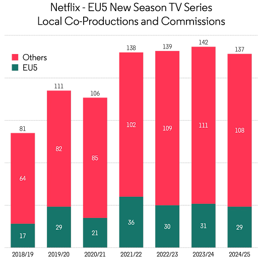 Netflix’s original content focus has seen significant growth in international markets. Show Tracker data shows that across all languages Netflix have been launching close to 140 New Season shows each season for the last four years (with returning shows on top of that number). The EU5 consistently represent over 20% of that volume, and whilst there is value in markets outside the originating market the primary return will be through supporting each local market. With these markets important to Netflix’s overall growth it will be interesting to follow their ongoing commissioning activity.