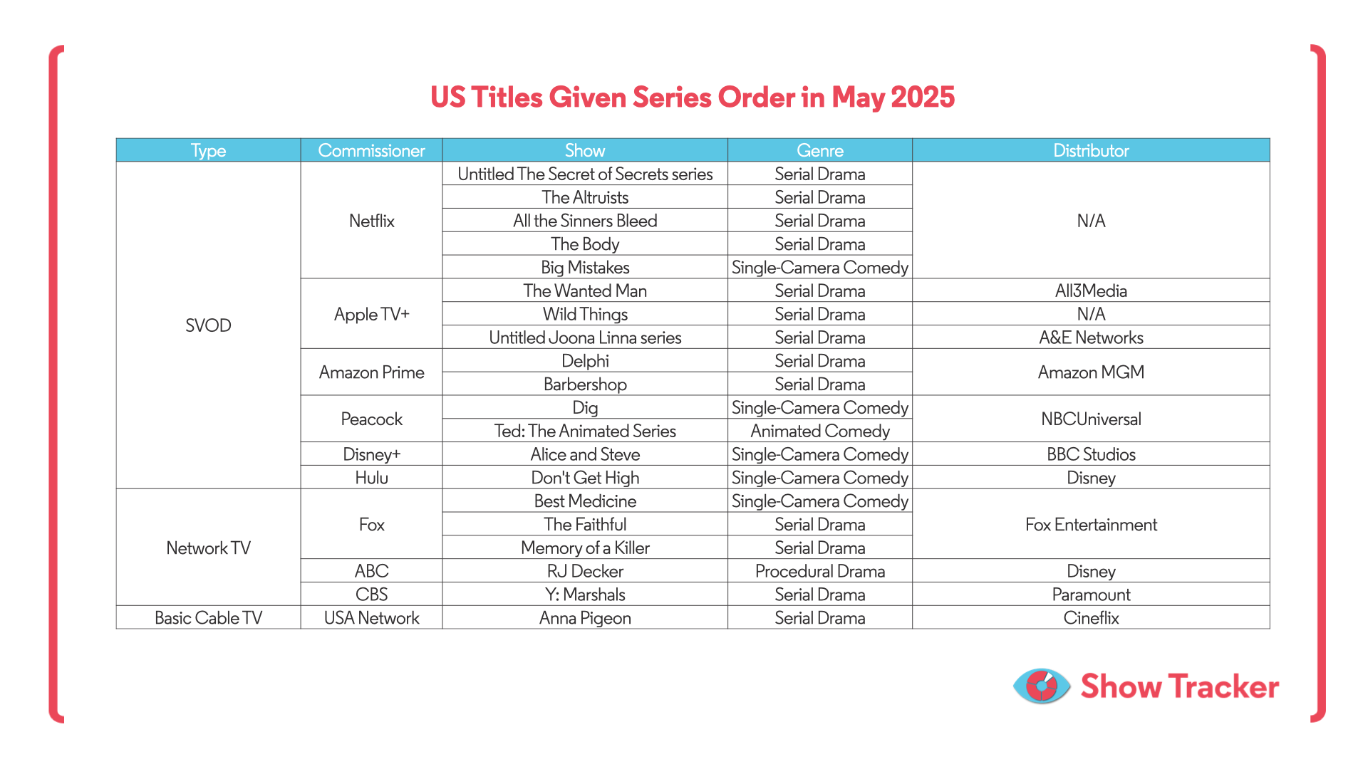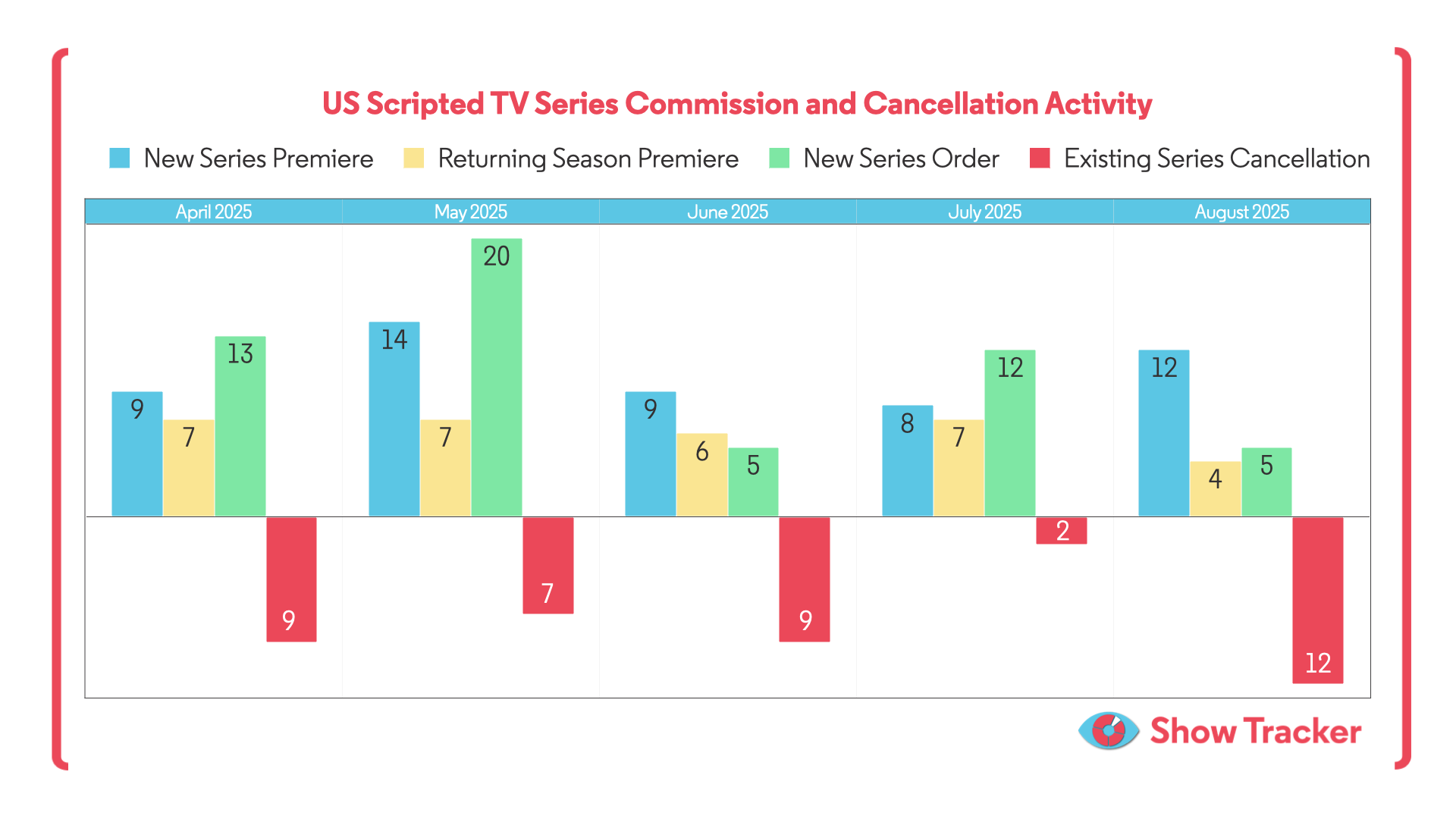 April, June and August 2025 saw the exact number of new US titles premiere as those that had been cancelled, with each month also consistently premiering an average of six additional scripted series returning for a new season.