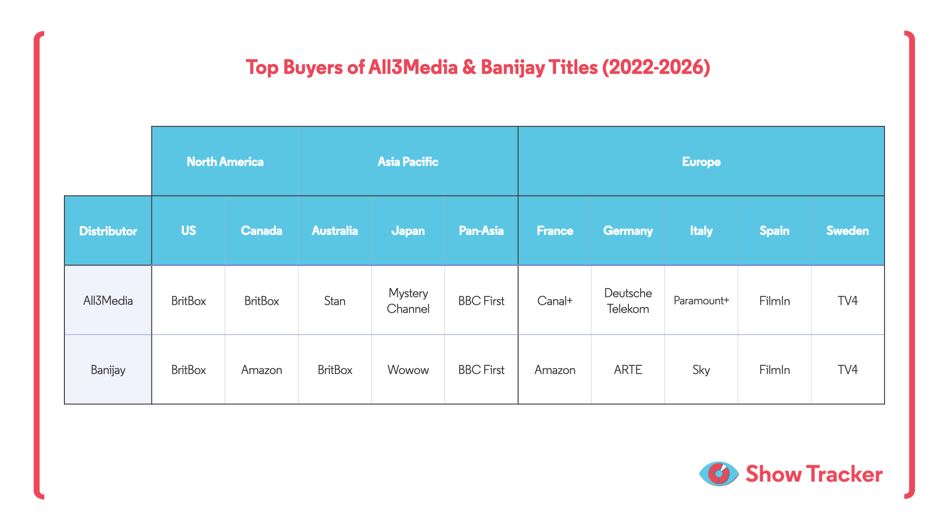 Show Tracker data across key global markets shows that many of the same platforms consistently acquire content from both distributors, pointing to closely aligned distribution strategies and demand profiles across multiple regions.